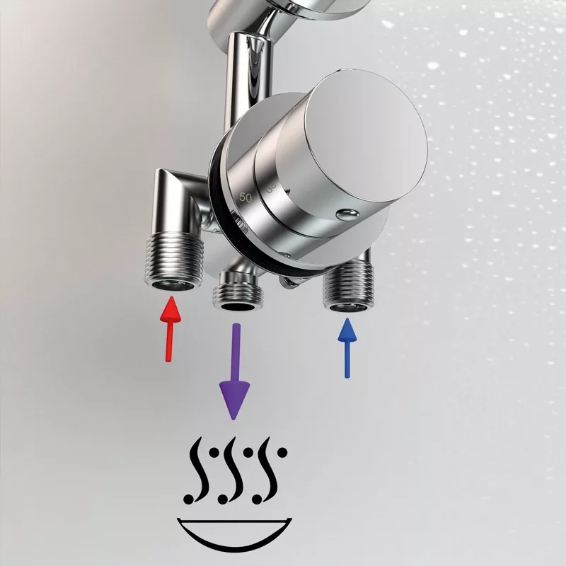Robinetterie 3 éléments en laiton chromé Mitigeur thermostatique avec cartouche Vernet® Robinet inverseur 4 fonctions Support de douchette réglable en laiton chromé Flexible de douchette inox avec embout rotatif |
