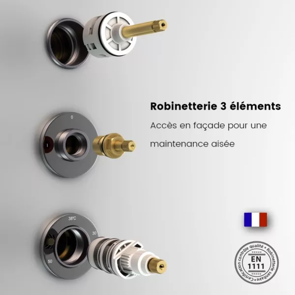 Robinetterie 3 éléments en laiton chromé Mitigeur thermostatique avec cartouche Vernet® Robinet inverseur 4 fonctions Support de douchette réglable en laiton chromé Flexible de douchette inox avec embout rotatif |